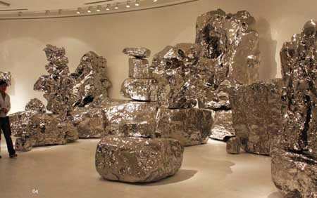 1.与传统审美的关系。他发现了传统资源可变的能量,这涉及到中国当代艺术面临的诸如此类的问题。如何理解传统?传统在今天到底有什么意义?传统如何被转换或转译(Translation)?我们从他作品中可以看到他不是把传统变成一种死的传统,而是把它看做是一个活的传统,而且是一种与当代性相联系的传统。我想最好用这样一句话说明较妥,展望的艺术在传统与现代、过去与未来、东方与西方之间进行了“再观念化”(re-conception)的处理——从1995年独立性和单体性的不锈钢假山石,到2000年前后的集合性不锈钢假山石群,都是通过这样的方法转译,从而形成了新的语言和形式。