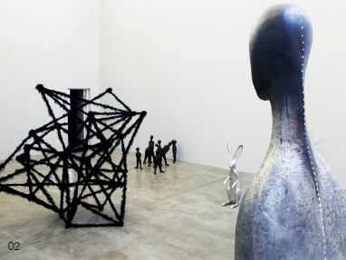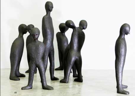 无论是尺度还是气度,他们都完全没有侵略性,没有昂扬的斗志和战胜什么的信心、勇气和力量——这次参展的是一个八件组合,而九件体组合的《拯救自己生命的人们》已经是汉克为数不多的“史诗性”作品了。在一般情况下,他们仅仅是充满诗性的迷惑和疑问,以他们的形体、姿态与题目一起构成一种极具浸淫或穿透力的尴尬“表情”——这是一个艺术家真正的天赋!