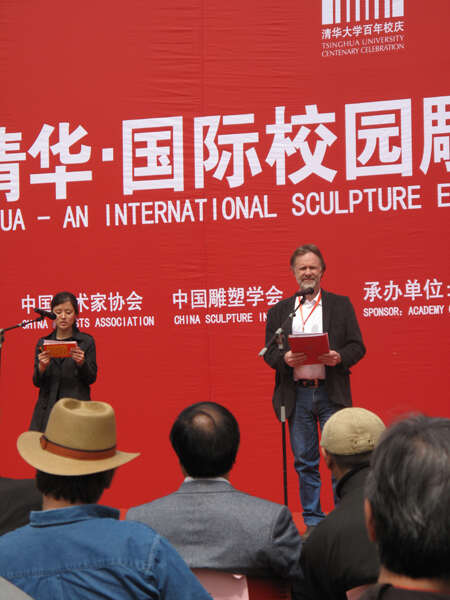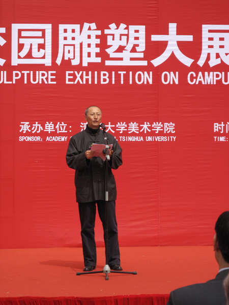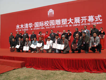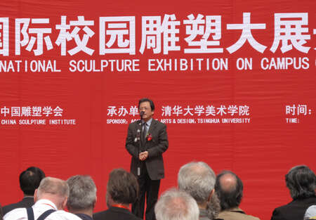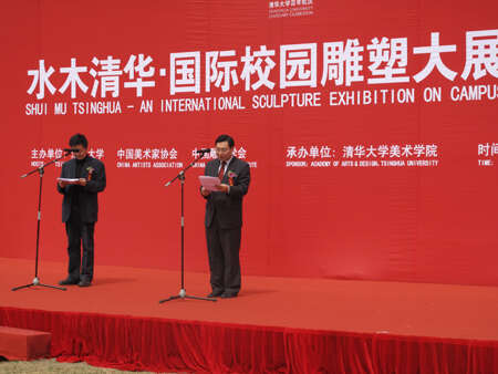 4月9日上午,清华大学百年校庆 “水木清华•国际校园雕塑大展”在清华大学紫荆雕塑苑隆重开幕。清华大学党委书记胡和平、 中国文联党组成员、书记处书记、副主席、中国美术家协会副主席、清华大学美术学院名誉院长冯远 、清华大学美术学院常务副院长郑曙旸、中国美术家协会副主席、中国雕塑学会会长、清华大学美术学院雕塑系主任、本次雕塑大展秘书长曾成钢、罗马皇家美术学院院长蒙加利、德国雕塑家约克等出席当天的开幕式并致辞。开幕式还邀请了国内外专家学者及参展的近百名艺术家、认捐雕塑作品的单位及个人,以及清华大学师生百余人,场面隆重热烈。